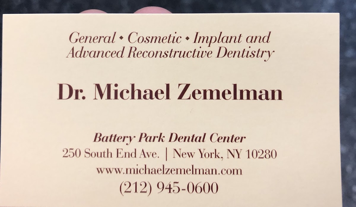 Dr. Michael Zemelman has been my General Dentist for over 20 years! The office is new and conveniently located in the Battery Park area of Manhattan. Everyone who works there; from the Dental Assistants to the Receptionist, are welcoming and friendly. They always seem to find time to accommodate my schedule. The doctor himself is very knowledgeable, experienced, and understanding. Thank you Doctor! I highly recommend this office !