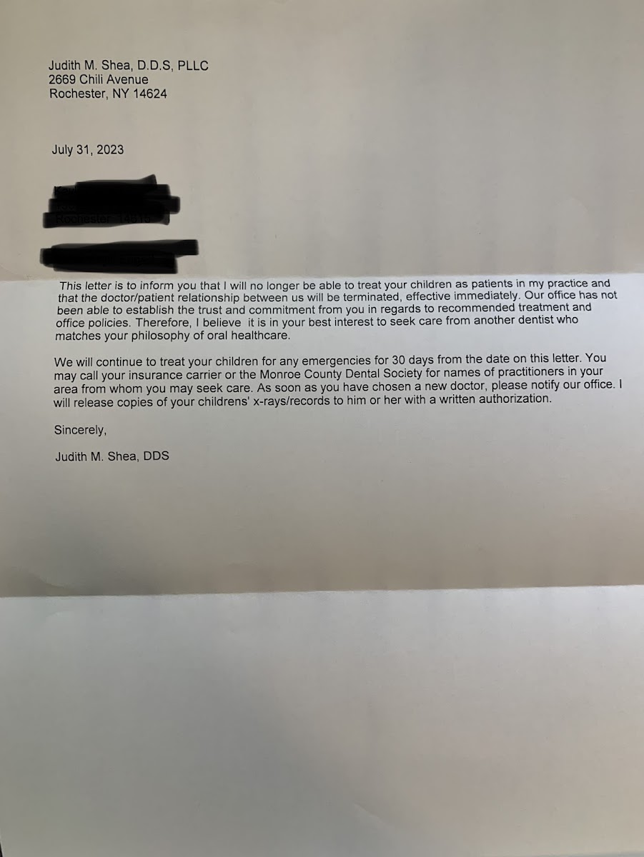 If a zero Star rating was possible that is what I would have selected. If you are considering Dr. Shea please do yourself a favor and run the other direction. We had been with Dr. Shea for a couple of years and her practice of treating children is borderline if not abusive. They do not let you back with your children, who are minors for any treatment. My 5 year old had a cleaning, got in the chair and sat with no problem, she got scared when they turned on the suction and their initial response was to push her back down and they encourage you to pin down your child. THIS IS NOT OK! When they did a filling on my 5 year old she was screaming in a way I have never heard and then the screaming suddenly stopped. I asked if she was finished and they said "no she fell asleep" What I am assuming happened is she passed out from all the screaming and them pinning her down. This is traumatizing for a child. Then my older daughter (9years) told me the last time she had a filling she started crying because the Novocain shot hurt and Dr. Shea covered her mouth and told her to stop crying, again completely unacceptable. They will also charge you a $30 fee to have someone "hold their hand" and call them an emotional support person when in all likelihood they are pinning you child to the chair. They also have a practice they call the papoose which is really just a board they put down under your child and physically strap them to it. That was the last straw, that is abusive and my child will not be held down or strapped down. When we left this practice I was told my 9 year old had another cavity and upon going to a new dentist for a cleaning she is surprisingly cavity free. Advocate for your children and please do not take them to Dr. Shea. My 5 year old is traumatized and now scared of the dentist thanks to Dr. Shea. She does not have any bedside manner and in my opinion should not be working with children. I do want to say that the young girl at the front desk is absolutely wonderful, but that was the only good thing about this practice.
